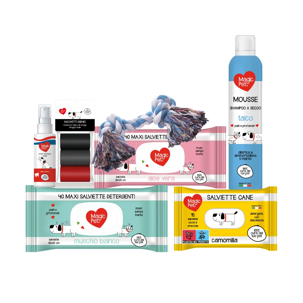La magia di Magic Pet racchiusa in un kit completo di 5 prodotti, perfetti per garantire al pet un’igiene profonda, una profumazione piacevole e il divertimento che merita.
