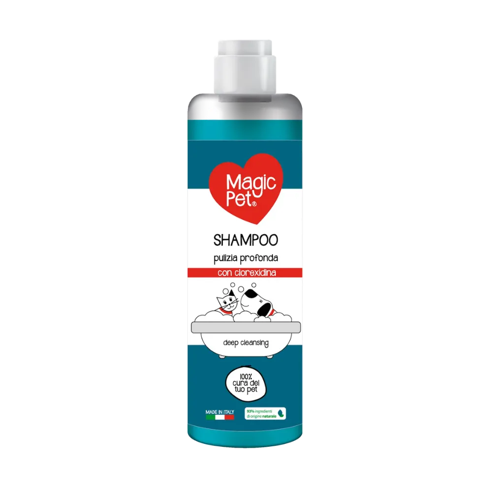 Lo Shampoo con Clorexidina igienizza e pulisce grazie alla formula bilanciata per tutti i tipi di pelo.