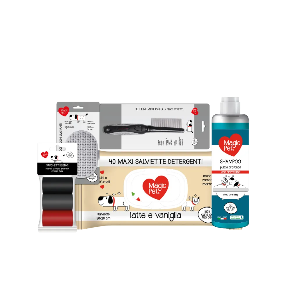 La magia di Magic Pet racchiusa in un kit completo di 5 prodotti, perfetti per garantire al pet un’igiene profonda, una profumazione piacevole e il divertimento che merita.