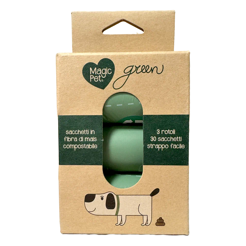I Sacchettini Igienici BIO di Magic Pet sono sacchettini per raccogliere i bisognini dei Pet, e sono realizzati in fibra di mais compostabile. 3 rotolini da 30 strappi, pratici, resistenti e adatti a tutti i tipi di dispenser. Confezione in carta riciclata e 100% riciclabile