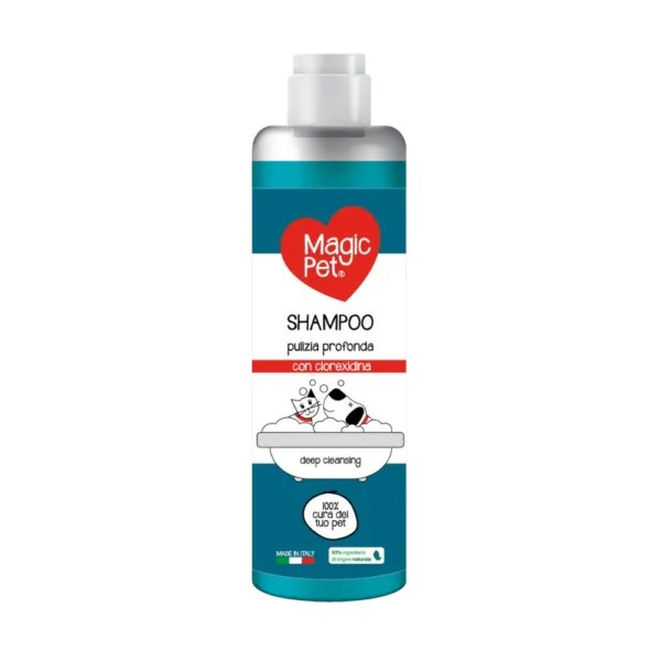 Lo Shampoo con Clorexidina igienizza e pulisce grazie alla formula bilanciata per tutti i tipi di pelo.